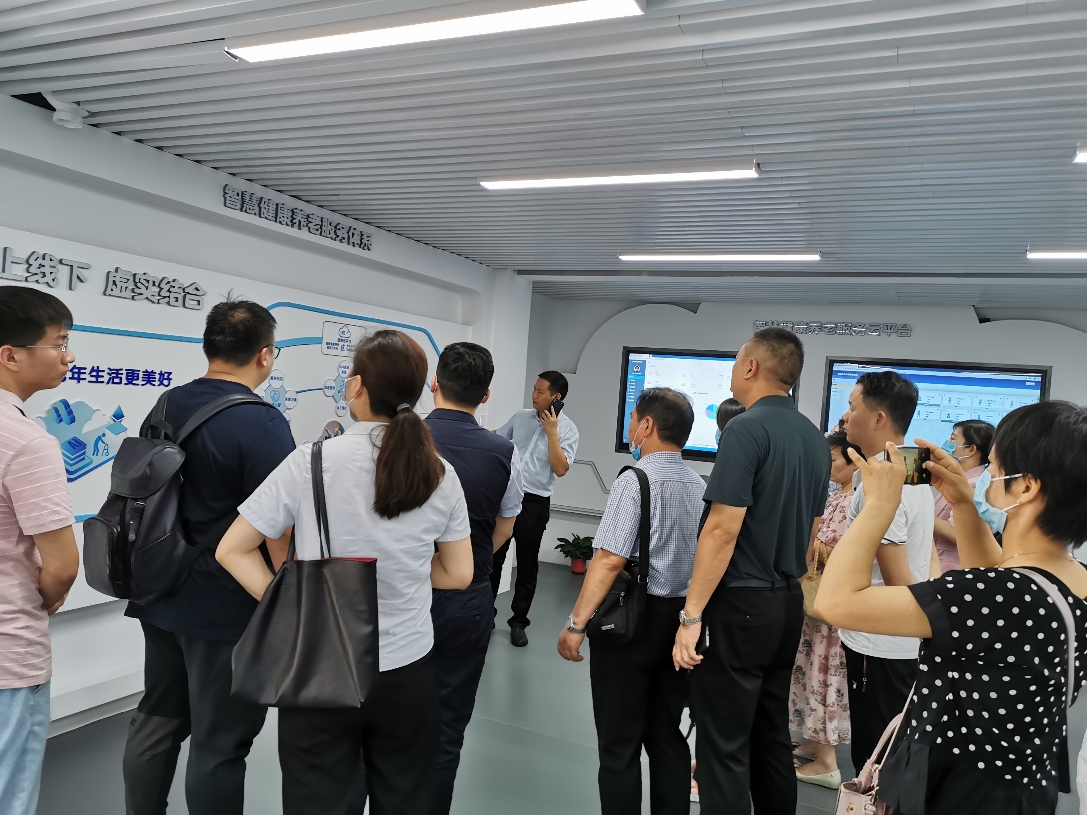 參會人員在劉泰副會長的帶領下,參觀了金水區智慧健康養老展示體驗中心的中控臺、接待廳、觀察室、老人居住房間、多功能廳、餐廳及智慧養老產品展示區。學習了解了智慧型養老帶給老人、家屬和機構的便利、舒適,智慧老年產品的功能、特點和使用方法。